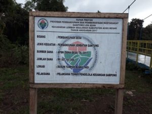 PM, Jantho – Pekerjaan proyek jembatan gantung yang menggunakan dana desa (DD) tahun 2017 di Gampong Lon Asan, Kecamatan Lembah Seulawah, Aceh Besar, diduga asal jadi.