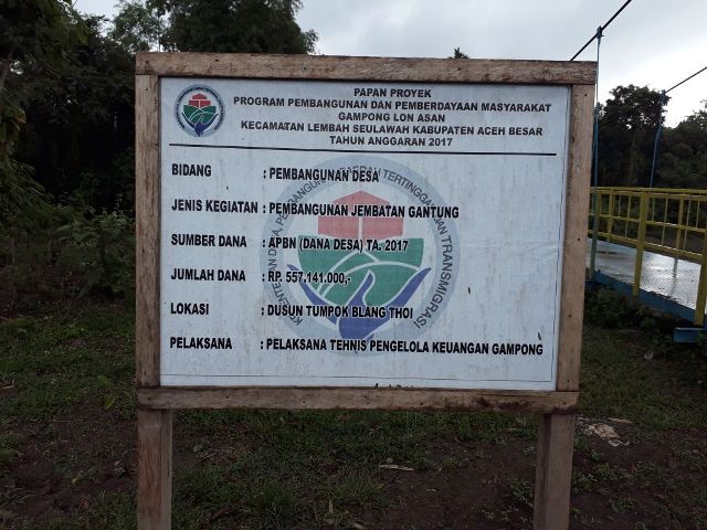 Kata sumber tersebut, jembatan titian itu dibangun pada tahun 2017 lalu saat geuchik gampong Lon Asan dijabat oleh Armia. “Saya tidak mengetahui pasti apakah itu ada dibahas dalam musrembang gampong atau usulan masyarakat,” tambahnya.
