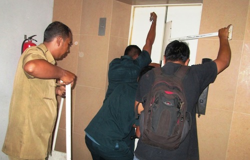 Saat mereka dekati, ternyata di dalam boks lift itu ada orang yang tidak bisa lagi keluar. Mereka kemudian minta pertolongan petugas Satpol PP dan WH di lobi kantor tersebut.