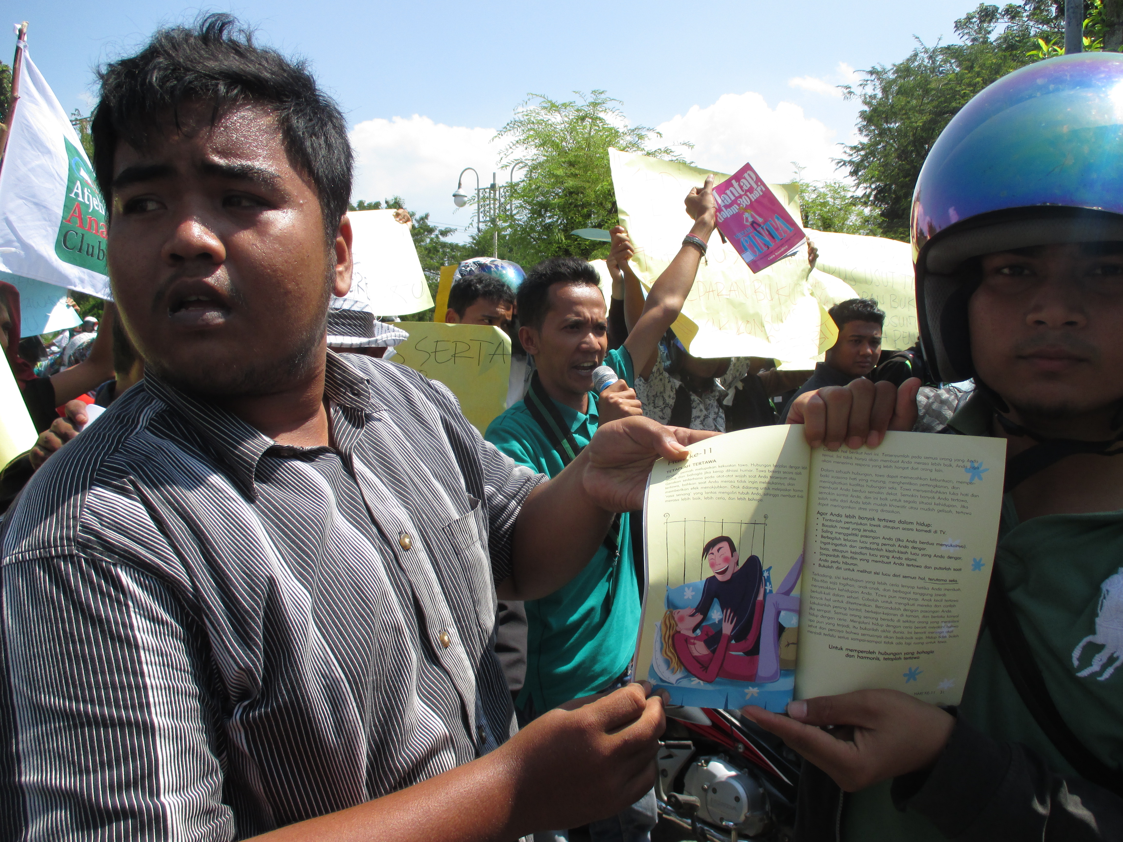 M Fajar Sidqi, koordinator aksi, dalam orasinya menyebutkan, aksi tersebut digelar setelah pihaknya menemukan beberapa buku keluaran salah satu penerbit nasional memuat gambar porno dan telah didistribusikan ke semua sekolah di Banda Aceh.
