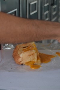 “Cuma,” kata Adi pada Pikiran Merdeka di akhir pekan ketiga April 2012, “kami mesti jual sepuluh ribu rupiah per bungkus.” Sekarang, mereka menjualnya Rp6 ribu saja per roti, dan menggunakan telur ras sebagai bahannya.